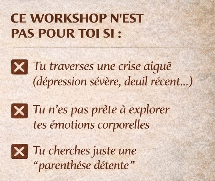Si vous traversez une crise aiguë (deuil, dépression sévère, etc.), ce workshop n’est pas adapté. Mais si vous êtes dans une phase de transition, de questionnement ou de fatigue profonde, alors oui — cet espace peut vous aider à retrouver du sens et de l’élan.
